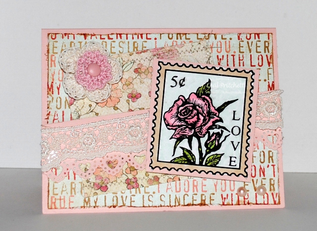 Copic markers, MS heart punch, Lace, Pearls, Crochet flowers, brad
