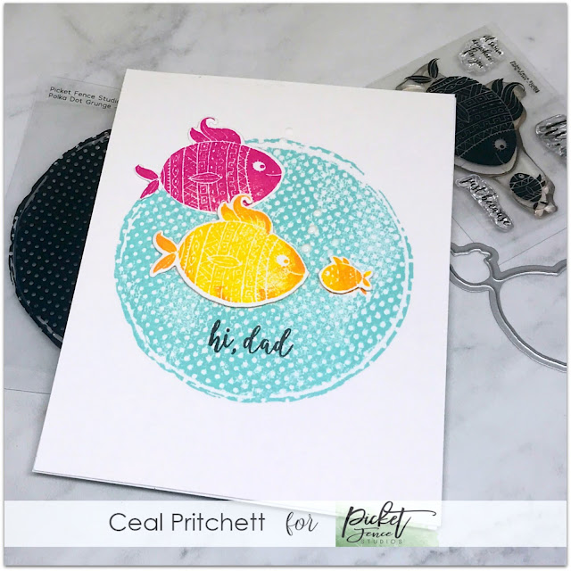 To create the card, I started with a white top folding card base. I stamped the Polka Dot Grunge another one of the June releases using Blue Lagoon ink by Gina K and then stamped the fish in Passionate Pink and Wild Dandelion and cut them out using the Coordinating die. You can also purchase the Bundle with includes both the stamp and die for a discounted price.
