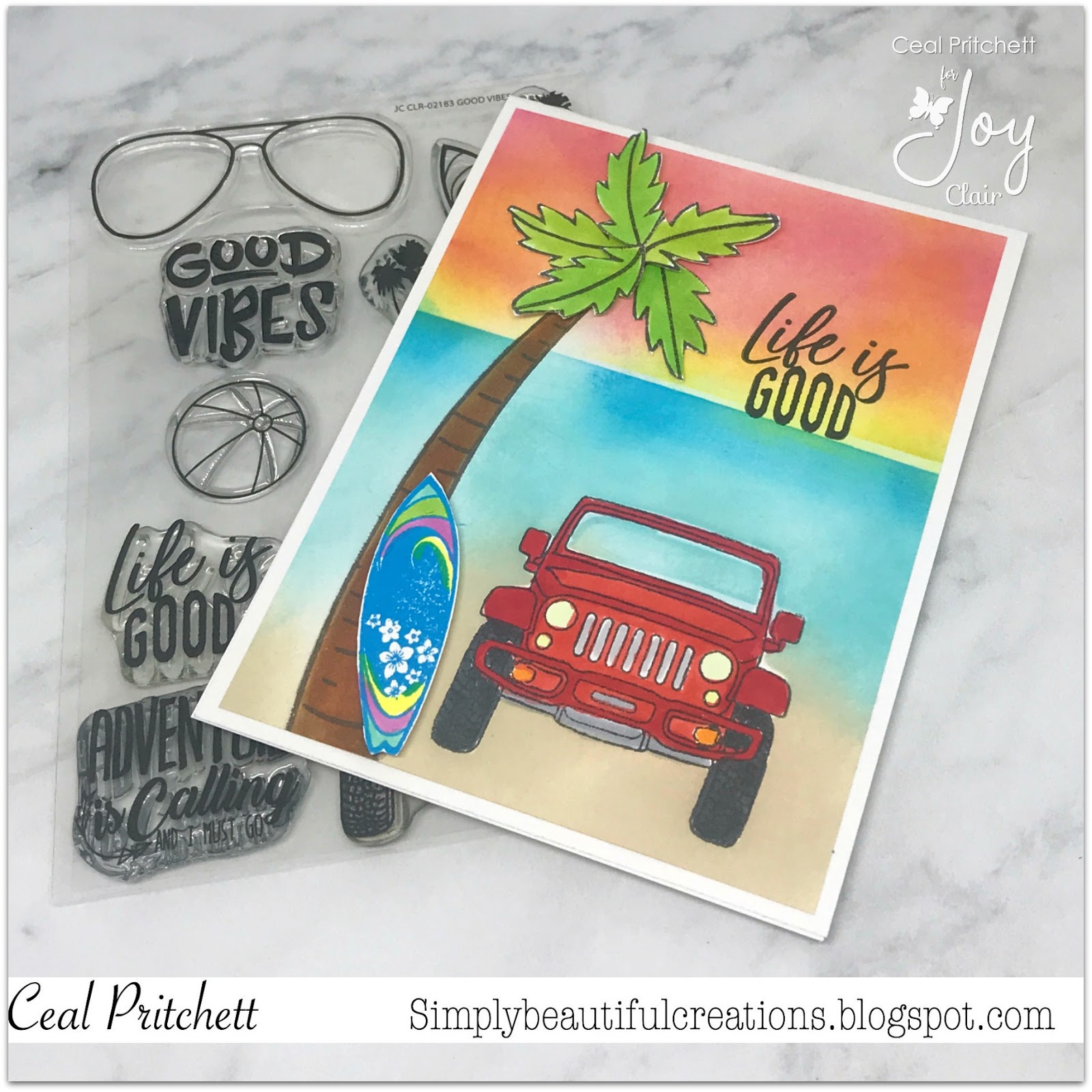 I am up on the Joy Clair blog today with this card using a couple of older sets, Good Vibes and Penguins Tropical Christmas. You may be thinking where is the Christmas? Well the palm tree is from the Penguins Tropical Christmas set, the rest is from the Good Vibes set.