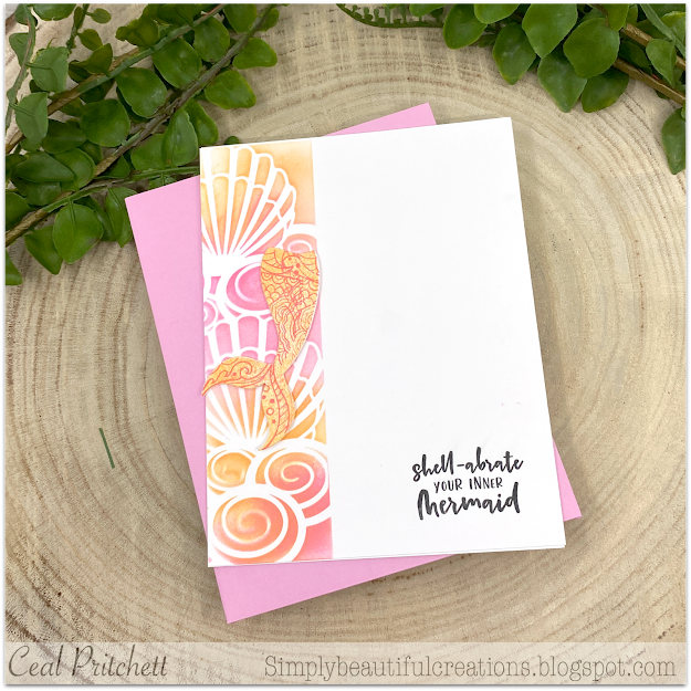 To create this card I started with a top folding white card base. I laid the stencil from Brutus Monroe over it and then used the Life Changing Blender Brushes to blend the two different inks Buttercup and Honeysuckle to create the border. Next I stamped the mermaid tail by Taylored expressions and cut it out with the coordinating die and popped it up on the background. To finish the card I added greeting by Ellen Hutson.