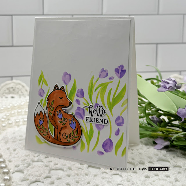 To make my card, I started with a white top folding A2 card base and a white panel. I Created a background by using the Color Layering Tulip Pattern stencils. I stamped the fox from the Folk Animals set on a seperate piece of cardstock, colored it and then cut it out with the coordinating die. To finish the card I added a sentiment from the Here for You bundle.